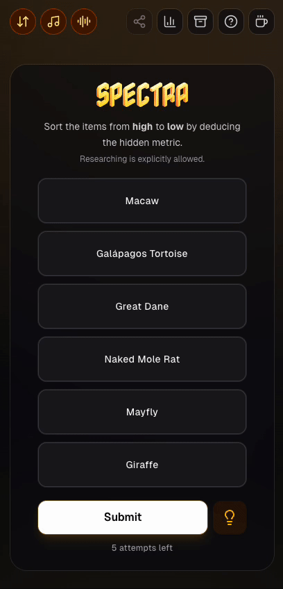 Spectra is a fresh take on deduction puzzles that combines deductive reasoning with the satisfaction of daily brain teasers. Each puzzle presents seemingly random items that you must sort from highest to lowest based on a hidden metric. The twist? The sorting criteria is never revealed upfront. Through strategic guessing and careful analysis of color-coded feedback, you uncover both the correct order and the underlying pattern – whether it's atomic numbers, release years, population sizes, or something completely unexpected. With a changing number of attempts (based on the difficulty) to crack each puzzle, Spectra rewards both logical thinking and creative lateral connections. A new puzzle drops daily, making it the perfect morning ritual for puzzle enthusiasts who crave something more cerebral than word games.